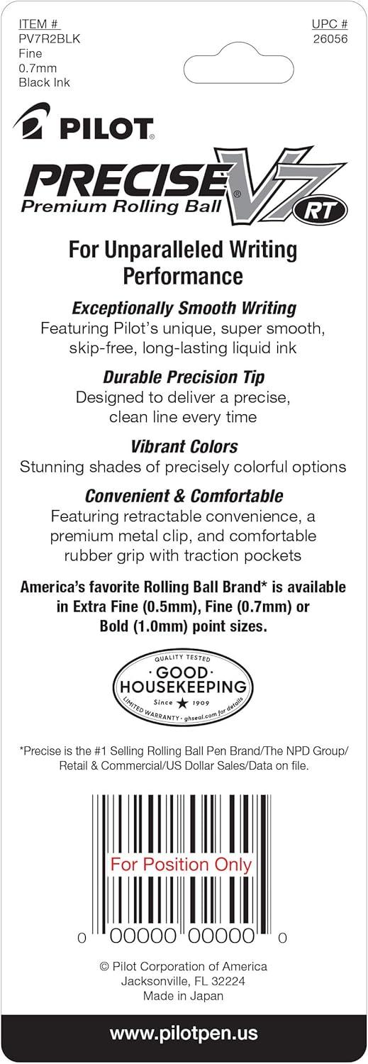 PILOT PRECISE V7 RT: This premium retractable rolling ball pen has a patented fine precision tip to deliver smooth, skip-free writing every time. Unparalleled performance for ultra-smooth writing.